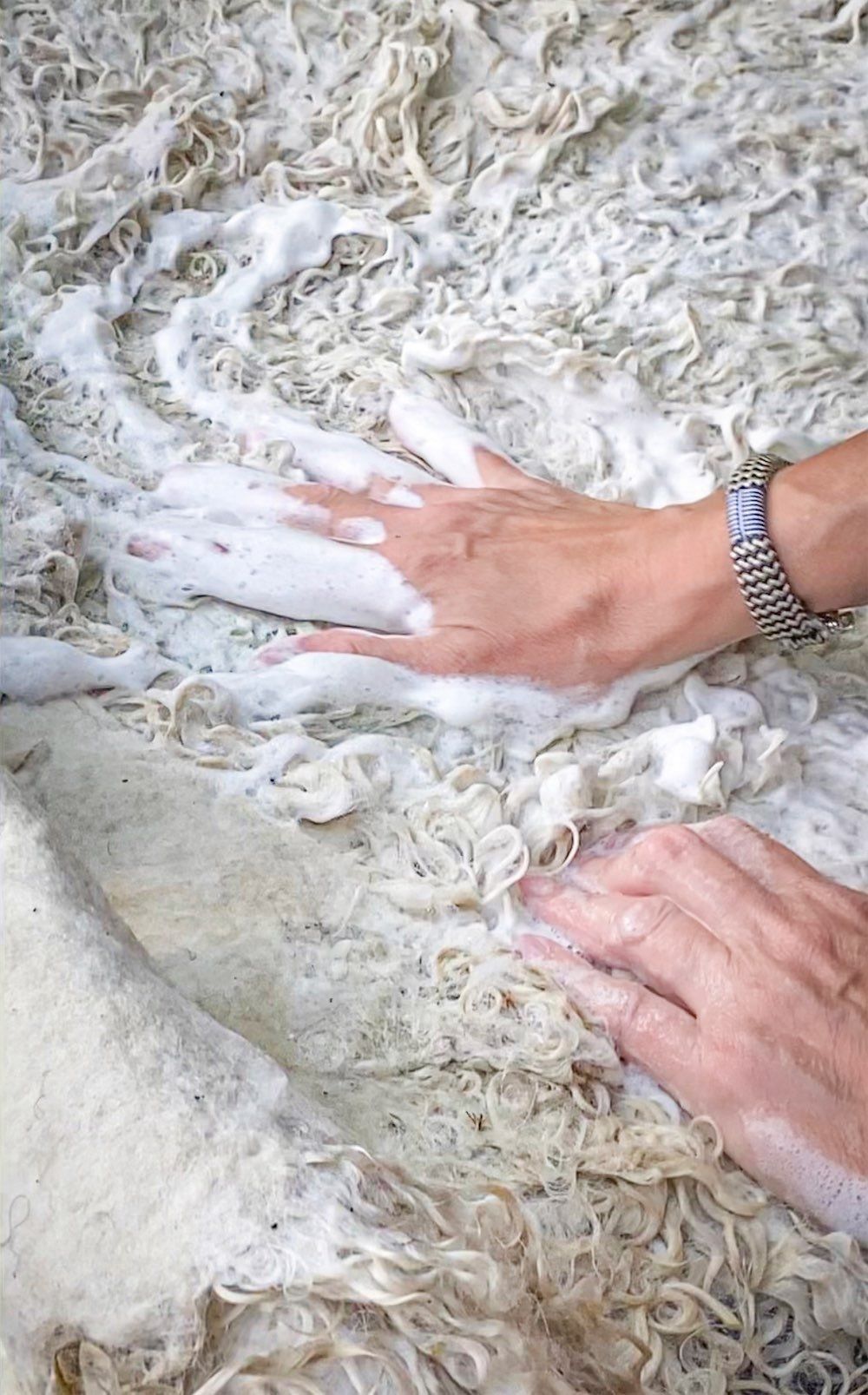 Ancient felting technique used to create living rugs. We transform the fleeces using an ancient felting technique to create cruelty free Felted Rug